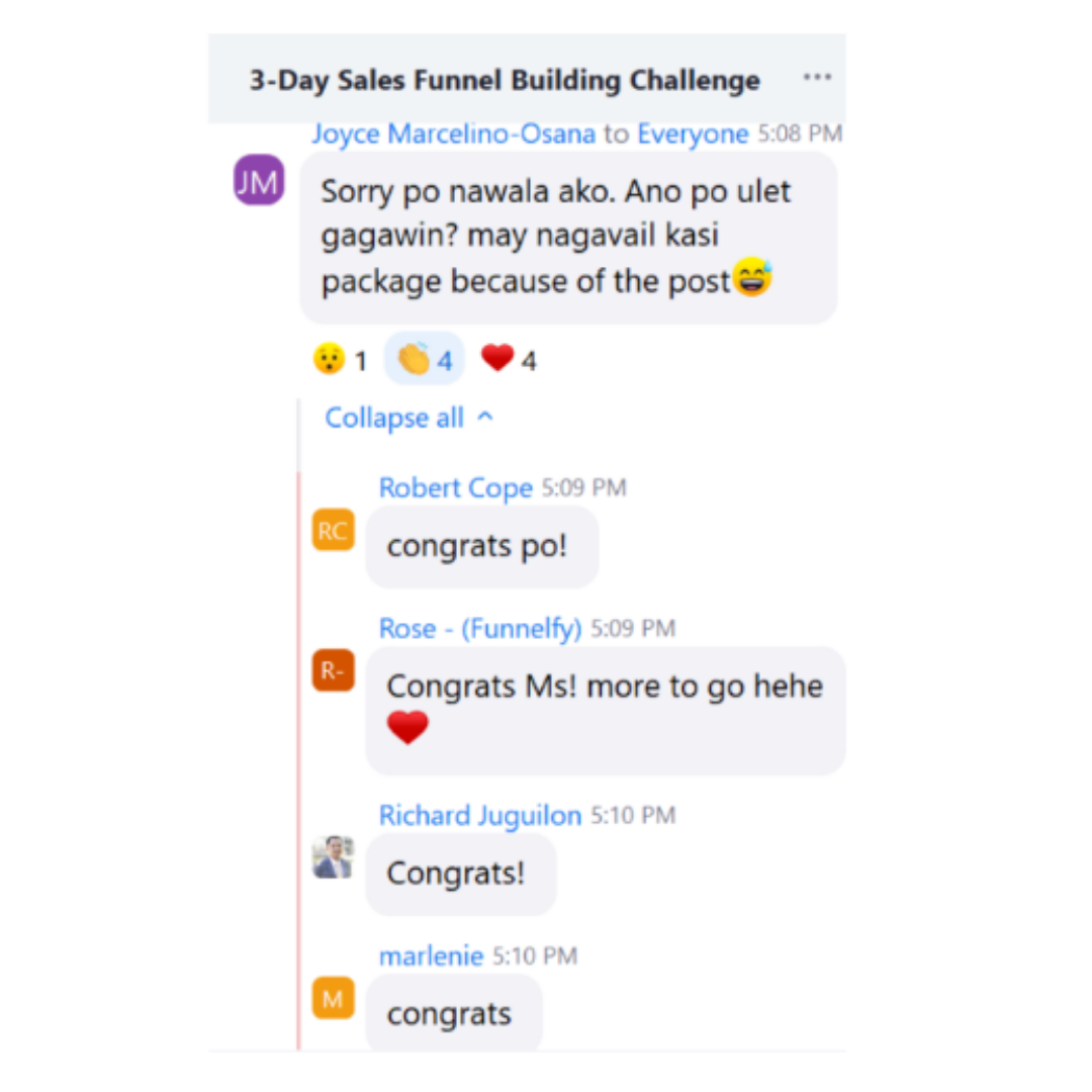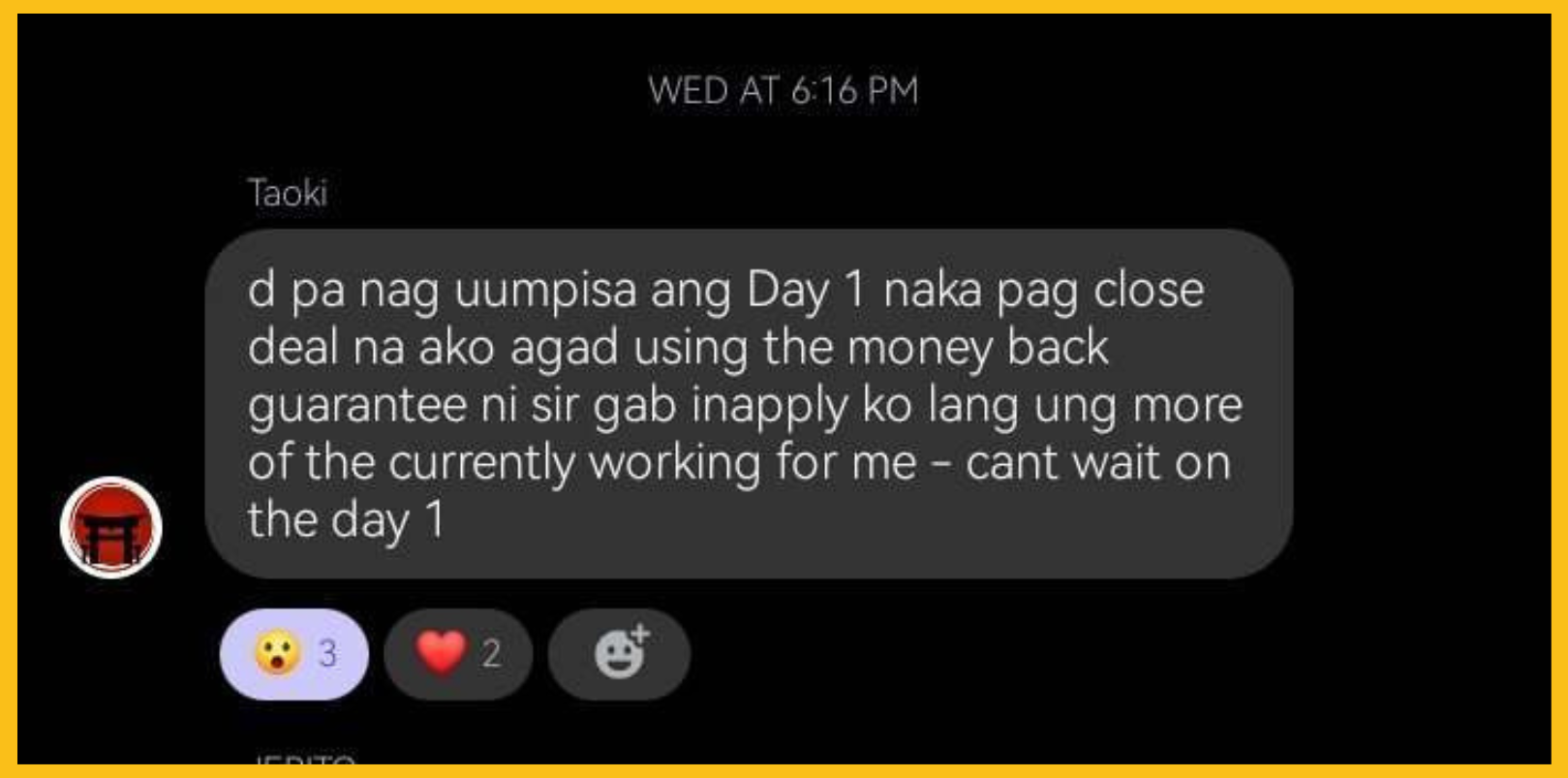 “I joined because I was tired of starting over without really starting. Matagal ko nang gustong makabuo ng sarili kong sales funnel pero kahit may tools na, may idea, at may experience sa ads, feeling ko may kulang… Day 1 pa lang, tinamaan na agad ako. Hindi pala tools ang kulang, kundi mindset pala.”